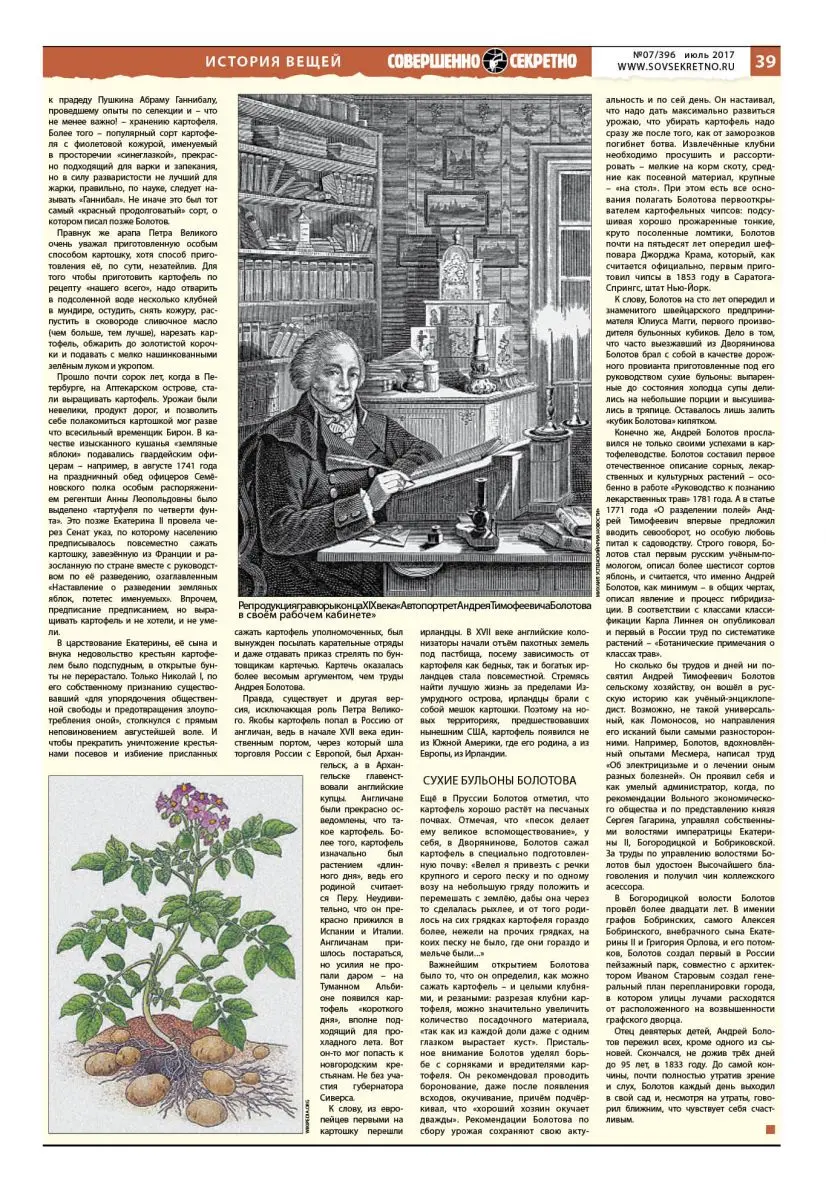 С картофелем всё оказалось как-никак сложнее, да и история «проникновения» картофеля на поля отечества довольно запутанная. По наиболее распространённой версии, царь Пётр, используя только-только открытое окно в Европу, прислал из Голландии, персонально – фельдмаршалу Шереметеву, мешок картошки и приказ немедленно приступить к посадкам. Несомненно, что посадки были, но только не картофеля: мешок, как часто бывает, куда-то запропастился, картошка, скорее всего, сгнила, Пётр Алексеевич был сильно во гневе. Но, помимо присланного Шереметеву, был и другой мешок. Он попал к прадеду Пушкина Абраму Ганнибалу, проведшему опыты по селекции и – что не менее важно! – хранению картофеля. Более того – популярный сорт картофеля с фиолетовой кожурой, именуемый в просторечии «синеглазкой», прекрасно подходящий для варки и запекания, но в силу разваристости не лучший для жарки, правильно, по науке, следует называть «Ганнибал». Не иначе это был тот самый «красный продолговатый» сорт, о котором писал позже Болотов.