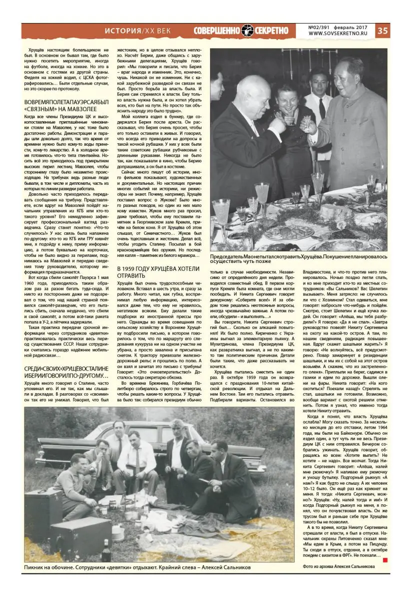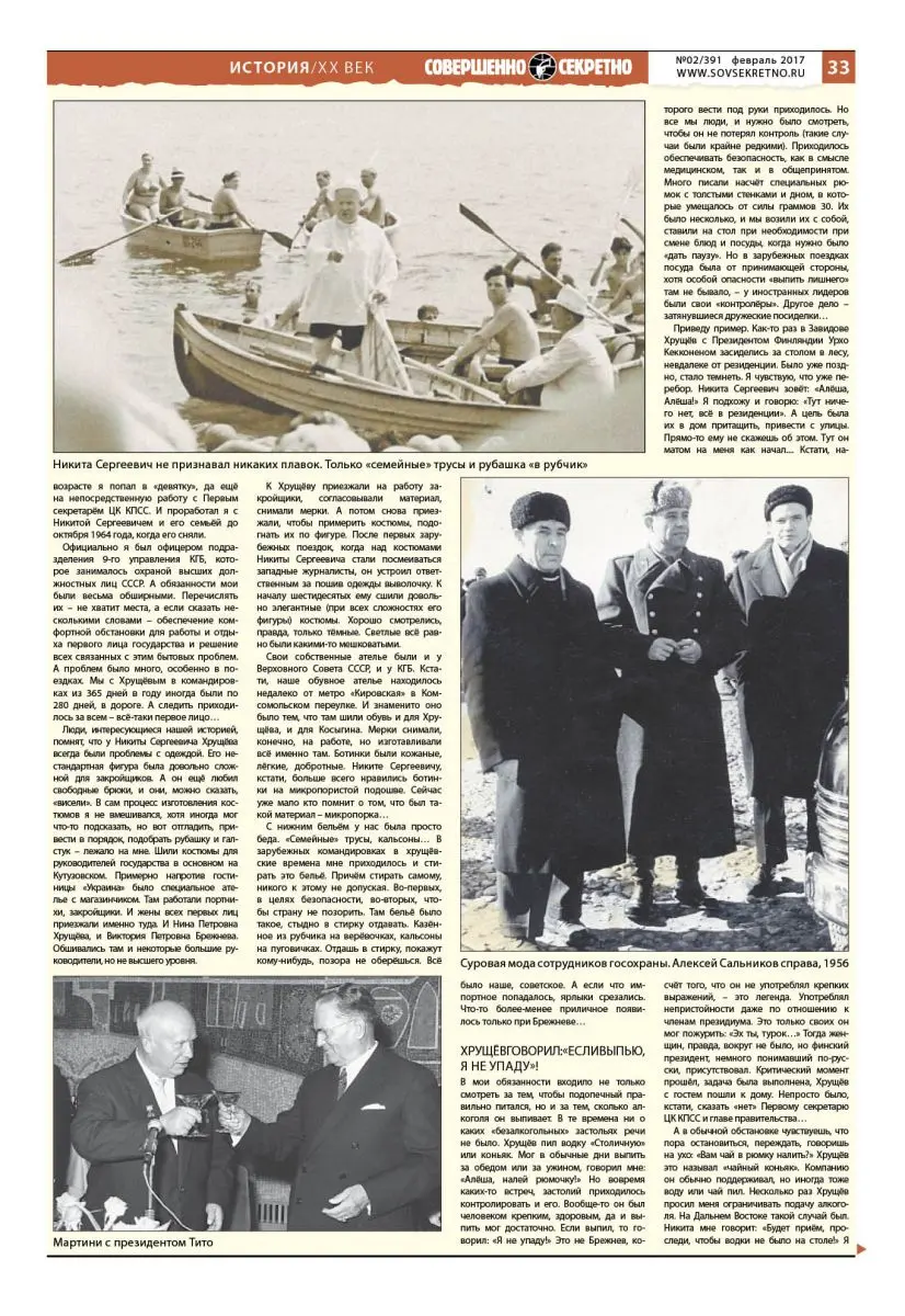 Повторюсь, Алексей Алексеевич Сальников прослужил в органах государственной охраны 40 лет. С 1956 по 1964 год – в охране Хрущёва. С 1964 по 1980 год – у Косыгина. А потом работал и с Брежневым, и с Андроповым, и с семейством Горбачёва. Частную жизнь Хрущёва и Косыгина он знал, что называется, от и до. Его считали просто членом семьи. На 80-летний юбилей к нему на скромную дачу приезжал внук Хрущёва, а поздравления он получил от многих родственников первых лиц СССР.