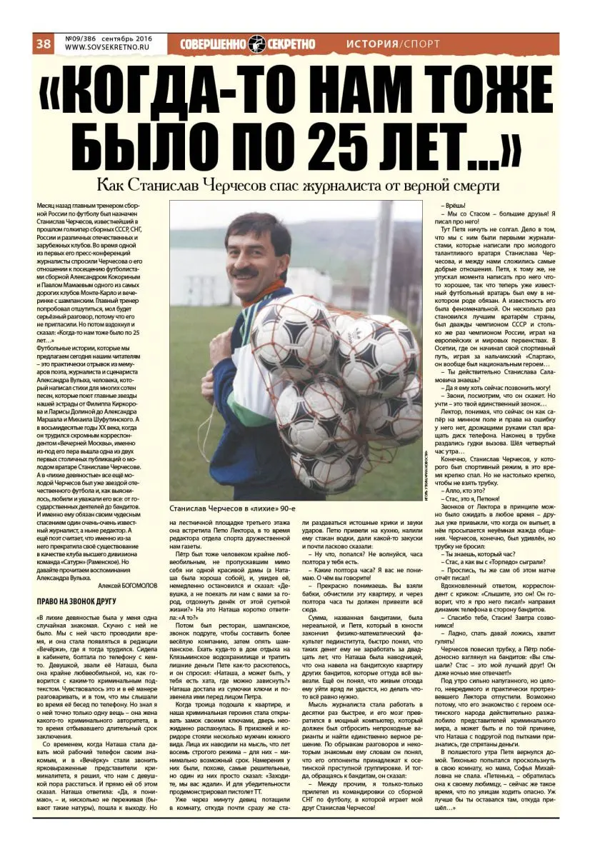 Тут Петя ничуть не солгал. Дело в том, что мы с ним были первыми журналистами, которые написали про молодого талантливого вратаря Станислава Черчесова, и между нами сложились самые добрые отношения. Петя, к тому же, не упускал момента написать про него что-то хорошее, так что теперь уже известный футбольный вратарь был ему в некотором роде обязан. А известность его была феноменальной. Он несколько раз становился лучшим вратарём страны, был дважды чемпионом СССР и столько же раз чемпионом России, играл на европейских и мировых первенствах. В Осетии, где он начинал свой спортивный путь, играя за нальчикский «Спартак», он вообще был национальным героем…