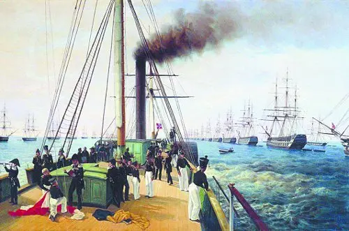 Смотр Балтийского флота Николаем I. Алексей Боголюбов. 1848. Точно так же Николай I провожал эскадру в средиземноморскую экспедицию в 1827 году