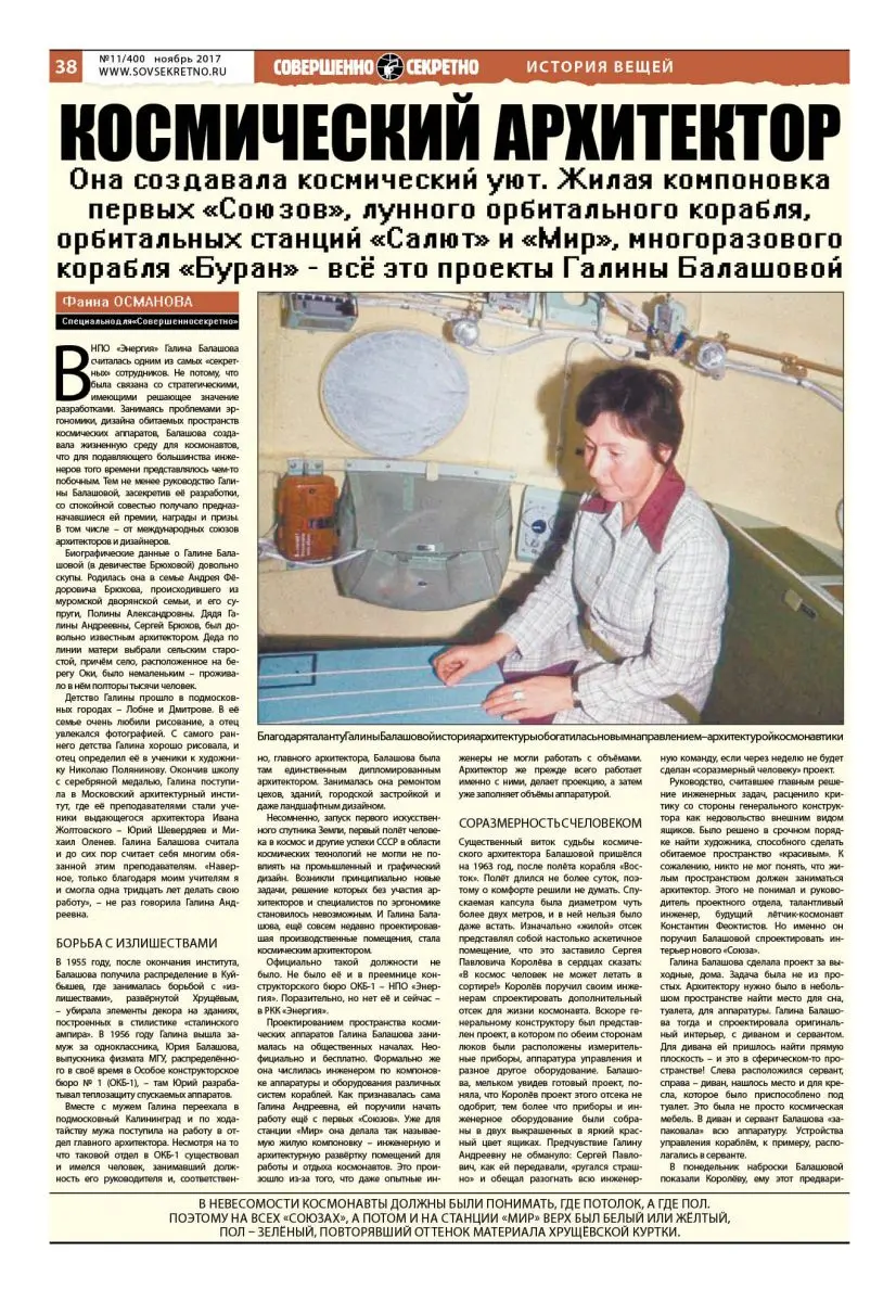 В НПО «Энергия» Галина Балашова считалась одним из самых «секретных» сотрудников. Не потому, что была связана со стратегическими, имеющими решающее значение разработками. Занимаясь проблемами эргономики, дизайна обитаемых пространств космических аппаратов, Балашова создавала жизненную среду для космонавтов, что для подавляющего большинства инженеров того времени представлялось чем-то побочным. Тем не менее руководство Галины Балашовой, засекретив её разработки, со спокойной совестью получало предназначавшиеся ей премии, награды и призы. В том числе – от международных союзов архитекторов и дизайнеров.