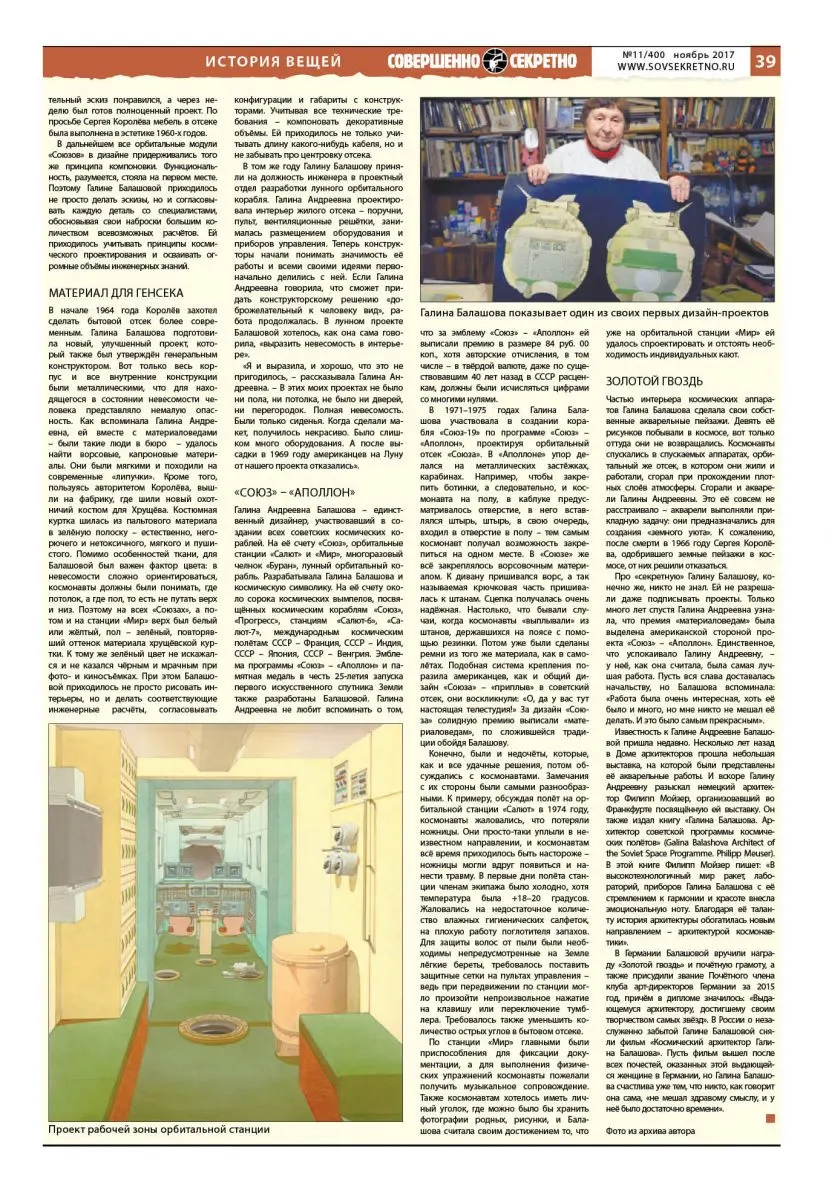 Галина Андреевна Балашова – единственный дизайнер, участвовавший в создании всех советских космических кораблей. На её счету «Союз», орбитальные станции «Салют» и «Мир», многоразовый челнок «Буран», лунный орбитальный корабль. Разрабатывала Галина Балашова и космическую символику. На её счету около сорока космических вымпелов, посвящённых космическим кораблям «Союз», «Прогресс», станциям «Салют-6», «Салют-7», международным космическим полётам: СССР – Франция, СССР – Индия, СССР – Япония, СССР – Венгрия. Эмблема программы «Союз» – «Аполлон» и памятная медаль в честь 25-летия запуска первого искусственного спутника Земли также разработаны Балашовой. Галина Андреевна не любит вспоминать о том, что за эмблему «Союз» – «Аполлон» ей выписали премию в размере 84 руб. 00 коп., хотя авторские отчисления, в том числе – в твёрдой валюте, даже по существовавшим 40 лет назад в СССР расценкам, должны были исчисляться цифрами со многими нулями.