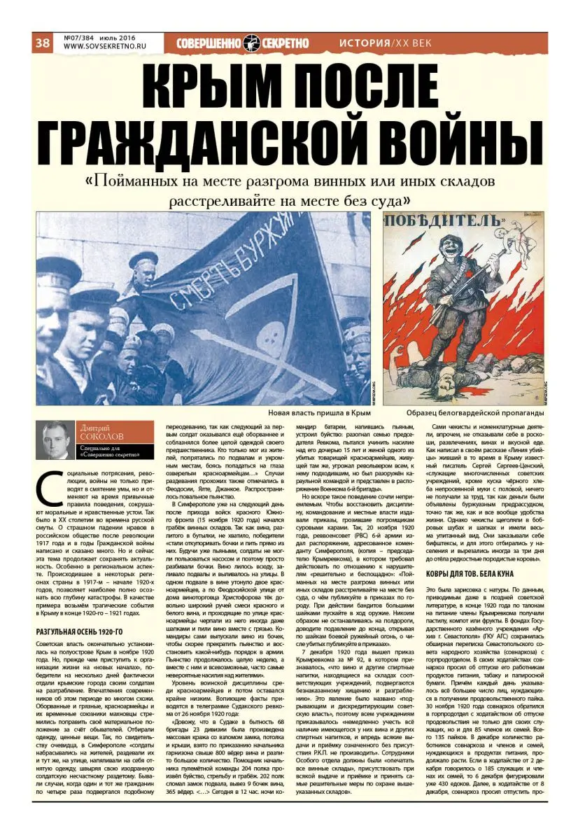 «Довожу, что в Судаке в бытность 68 бригады 23 дивизии была произведена массовая кража со взломом замка, потолка и крыши, взято по приказанию начальника гарнизона свыше 800 вёдер вина и разлито большое количество. Помощник начальника пулемётной команды 204 полка произвёл буйство, стрельбу и грабёж. 202 полк сломал замок подвала, вывез 9 бочек вина, 365 вёдер. <…> Сегодня в 12 час. ночи командир батареи, напившись пьяным, устроил буйство: разогнал семью председателя Ревкома, пытался учинить насилие над его дочерью 15 лет и женой одного из убитых товарищей красноармейцев, живущей там же, угрожал револьвером всем, к нему подходившим, но был разоружён караульной командой и представлен в распоряжение Военкома 6-й бригады».
