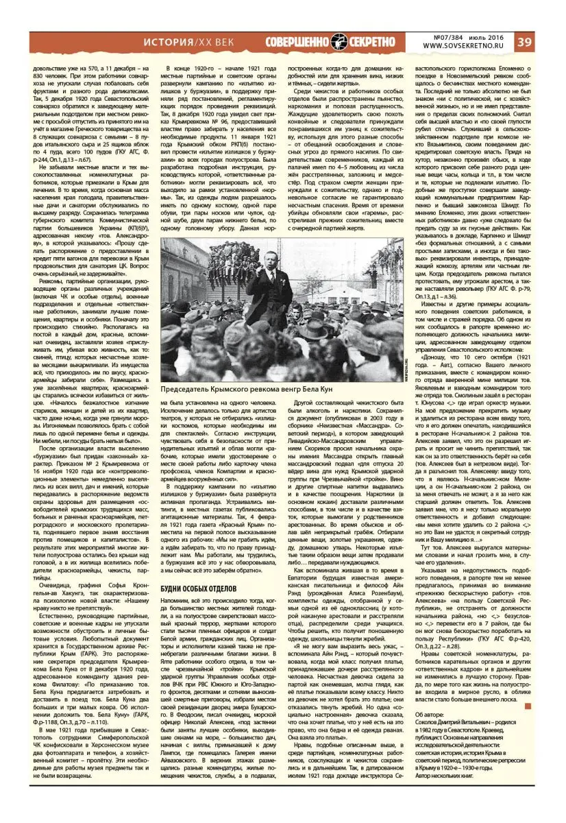 Нравы, подобные описанным выше, в среде партийцев, номенклатурных работников, совслужащих и чекистов сохранялись и в дальнейшем. Так, в датированном июлем 1921 года докладе инструктора Севастопольского горисполкома Еломенко о поездке в Новоземельский ревком сообщалось о бесчинствах местного коменданта. Последний не только абсолютно не был знаком «ни с политической, ни с хозяйственной жизнью», но и не имел представления о пределах своих полномочий. Считал себя высшей властью и «по своей глупости рубил сплеча». Служивший в сельскохозяйственном подотделе при комхозе некто Вязьмитинов, своим поведением дискредитировал советскую власть. Придя на хутор, незаконно произвёл обыск, в ходе которого присвоил себе разного рода ценные вещи: часы, кольца и т.п., в том числе и те, которые не подлежали изъятию. Подобные же проступки совершали заведующий коммунальным предприятием Карпенко и бывший завкомхоза Шмидт. По мнению Еломенко, этих двоих «ответственных работников» давно «уже следовало бы предать суду за их гнусные действия». Как указывалось в докладе, Карпенко и Шмидт «без формальных отношений, а с самыми простыми записками, а иногда и без таковых» реквизировали инвентарь, принадлежащий комхозу, артелям или частным лицам. Когда председатель ревкома пытался протестовать, ему угрожали арестом, а также наставляли револьвер (ГКУ АГС Ф. р-79, Оп.13, д.1 – л.36).