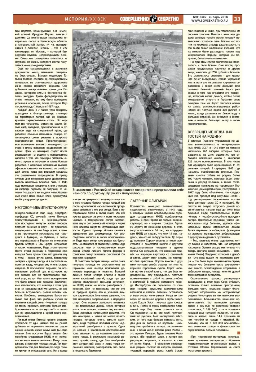 Окончательно процесс репатриации завершился в 1950 году. Срок отбывать остались только военные преступники, большая часть немецких солдат благополучно отправилась на историческую родину. Некоторые из них написали воспоминания. Большинство немецких военнопленных (по немецким данным, около 3 486 000, по советской сводной статистике, 2 389 560) хоть и испытали горький вкус «русской полыни», но остались в живых: лишь 14,9 процента из них погибли от голода и лишений. Напомним, что из 5 270 000 военнопленных советских солдат в фашистских лагерях погибли больше половины.