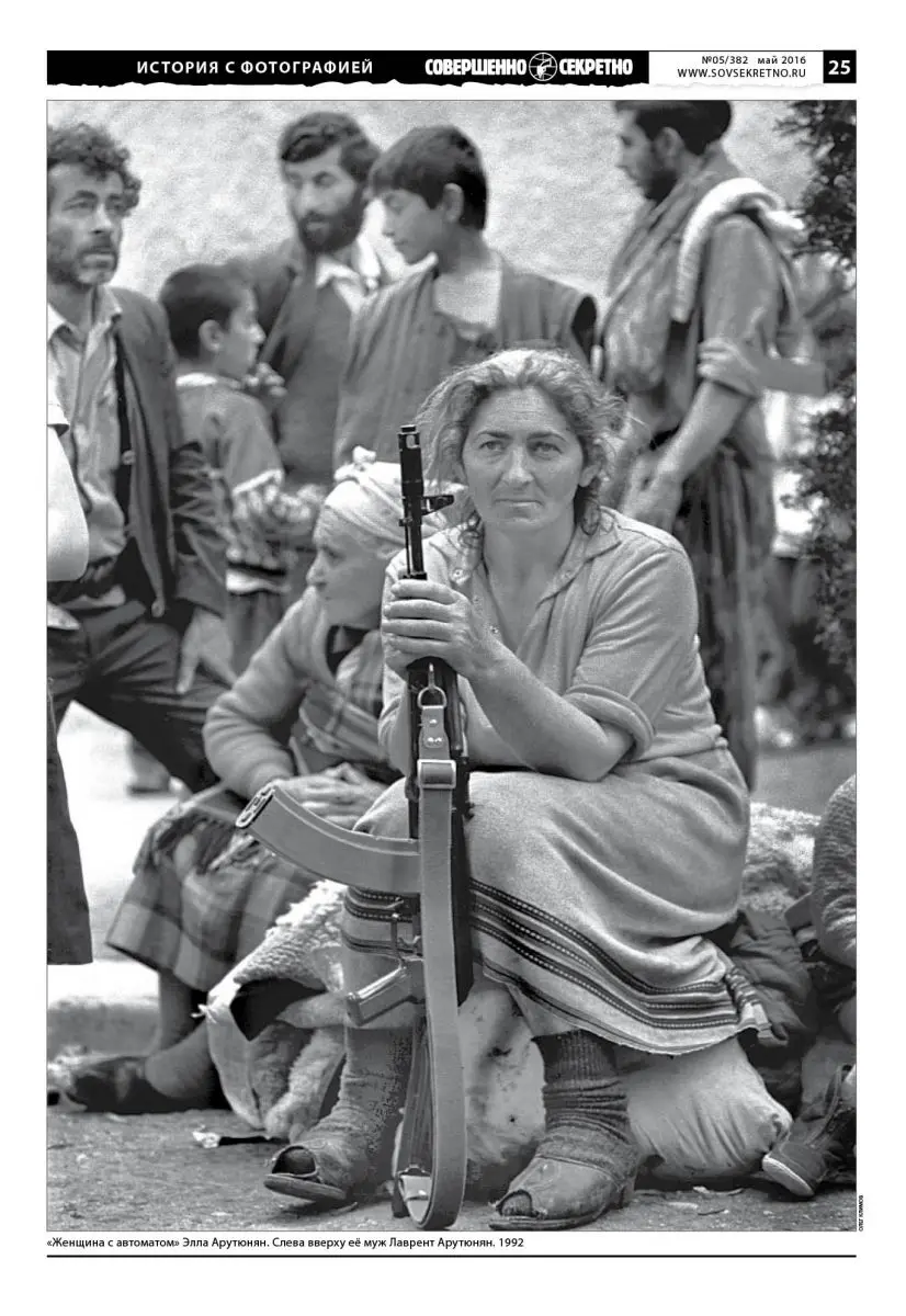 «Женщина с автоматом» Элла Арутюнян. Слева вверху её муж Лаврент Арутюнян. 1992