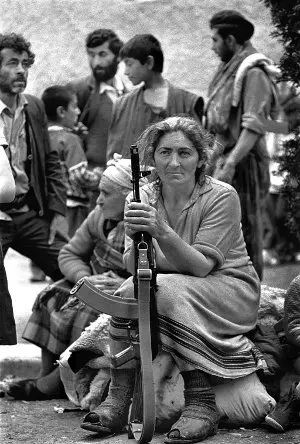 Эту фотографию «Женщина с «калашниковым» я сделал в июне 1992 года в Степанакерте. Она пришла пешком из Шаумяновского района. Я не знал, как её зовут и почему у неё в руках автомат. «Это простая история», – тогда казалось мне. Вокруг были сотни беженцев, но я выбрал её только потому, что у неё в руках был автомат. Фотографы всегда ищут образ, форму или клише – символы событий. Так поступил и я. Присел на колено, снял чуть больше 15 кадров подряд, наблюдая за тем, как меняются события на фоне «главного героя», и пошёл себе дальше. У меня простая профессия – идти и смотреть. Второй раз я увидел эту женщину спустя 20 лет.