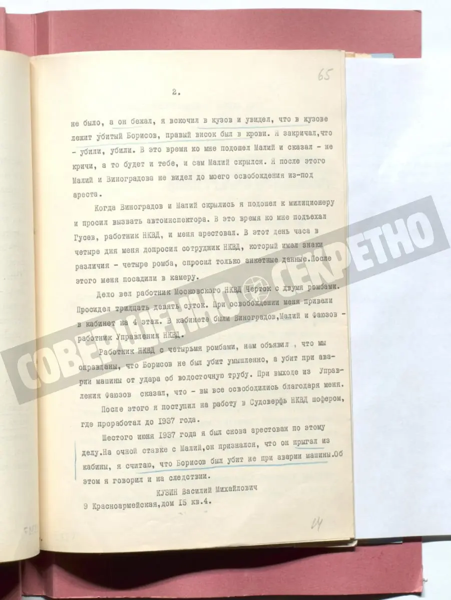 Якушевым были процитированы показания чекиста Виноградова: «В этот момент я ударил Борисова железным бруском по голове. Машина остановилась, вскочивший ко мне в кузов Малий, выхватив из моих рук железный брусок, ещё раз ударил им лежавшего на полу машины Борисова по голове…. Так был убит Борисов». Малий и Виноградов Военной коллегией суда были осуждены к расстрелу, а Кузина следователь Якушев освободил, и тот не был репрессирован.