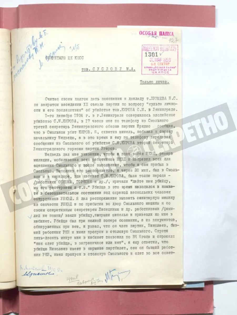 P.S. После ознакомления с архивными документами по убийству Кирова я пришёл к неутешительным выводам. В 1964 году была проведена ещё одна проверка обстоятельств убийства Кирова, но справка по результатам дополнительной проверки обстоятельств убийства С.М. Кирова от 1964 года до сих пор не обнаружена. Скорее всего, и она, и сотни других материалов до сих пор лежат в ведомственных архивах. Так что реальную картину этого загадочного события нашей истории можно будет воссоздать только при истребовании абсолютно всех имеющихся документов Генеральной прокуратурой с проведением профессионального следствия. Время для этого, как считают многие мои коллеги-историки, пришло уже давно…