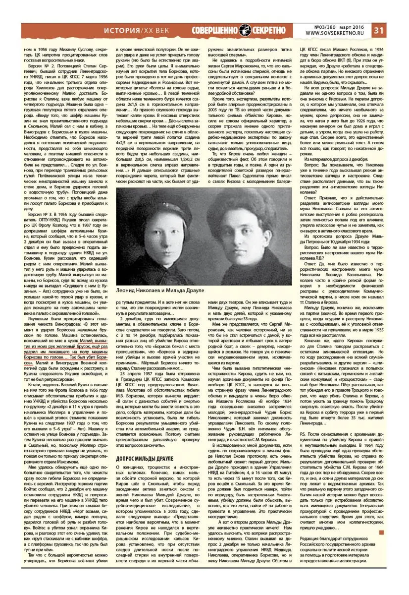 А вот о втором допросе Мильды Драуле неизвестно практически ничего! Нам удалось выяснить, что вопреки распространенному мнению, Сталин вызывал на допрос 2 декабря не только начальника Ленинградского управления НКВД Медведя, Николаева, оперативника Борисова, но и жену Николаева Мильду Драуле. Об этом в ЦК КПСС писал Михаил Росляков, в 1934 году член Ленинградского обкома и кандидат в бюро обкома ВКП (б). При этом он утверждал, что Драуле «работала в спецотделе обкома партии». Но никакого отражения в архивных документах этот допрос пока не нашёл. Видимо, было, что скрывать…