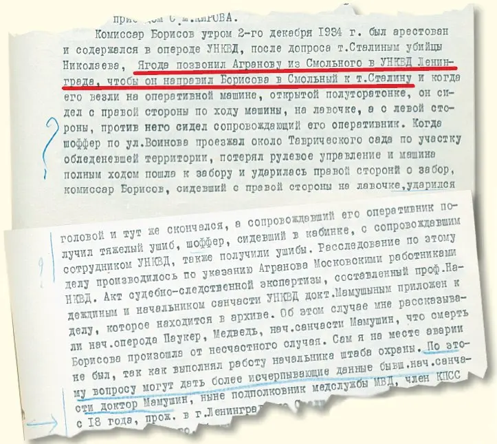 2 декабря, судя по имеющимся документам, в обвинительном ключе о Борисове следователи не говорили. Зато потом, с 3 по 14 декабря, подбирались показания разных лиц об убийстве Кирова относительно того, что «Борисов бежал с места происшествия», что «Борисов в задержании убийцы и вызове врачей участия не принимал»… Мёртвый Борисов ничего товарищу Сталину рассказать не мог