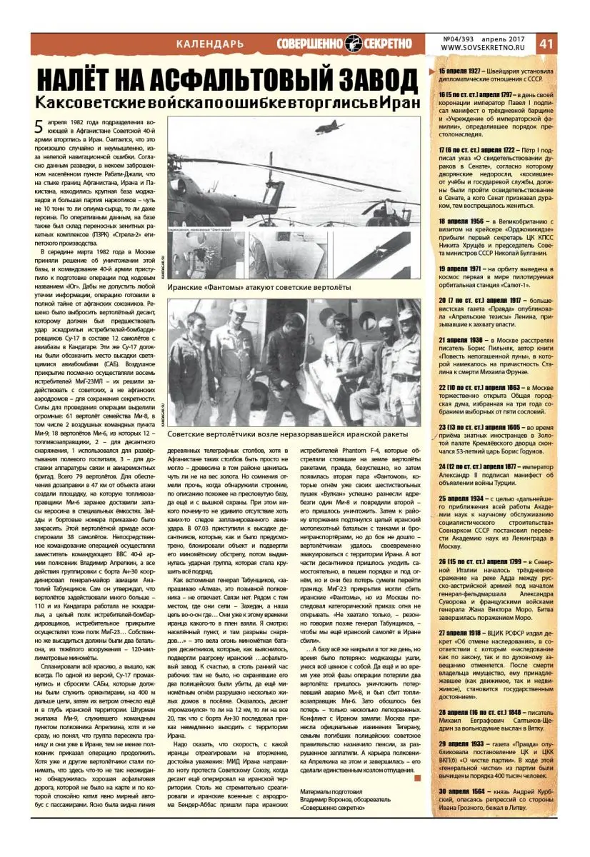 …А базу всё же накрыли в тот же день, но время было потеряно: моджахеды ушли, унеся всё ценное с собой. Да ещё и во время уже этой фазы операции потеряли два вертолёта: пришлось уничтожить потерпевший аварию Ми-8, и был сбит топливозаправщик Ми-6. Зато обошлось без потерь – только несколько легкораненых. Конфликт с Ираном замяли: Москва принесла официальные извинения Тегерану, семьям погибших полицейских советское правительство назначило пенсии, за разрушенное заплатили. А карьера полковника Апрелкина на этом и завершилась – его сделали единственным козлом отпущения.