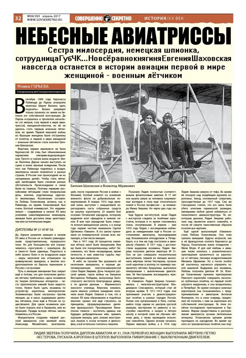 В небо не пускали без документа об окончании авиашколы, и первым дипломированным пилотом-авиатриссой стала Лидия Зверева. Дочь генерала русской армии, героя войны на Балканах Виссариона Лебедева, выпускница Белостокского института благородных девиц, а по другим данным, – Мариинского женского училища. Впрочем, неважно, какое именно учебное заведение окончила юная Лидия. Главное в том, что в начале ХХ века образование в подобных женских «вузах» всё ещё строилось на принципах, сформулированных деятелем французского Просвещения Фенелоном: главное – воспитать «девиц» как будущих добродетельных жён, привить хорошие манеры, дать знание иностранных языков и основ истории и философии, а всё остальное считалось лишним.