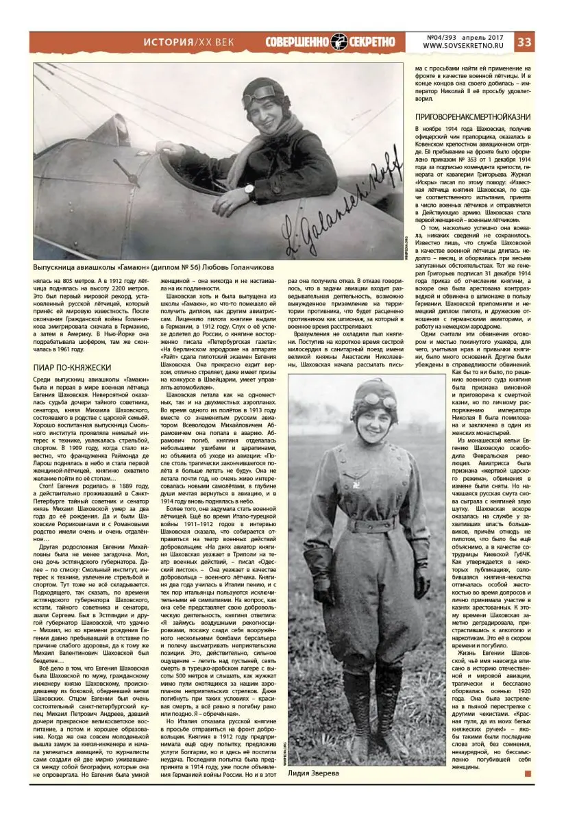 Жизнь Евгении Шаховской, чьё имя навсегда вписано в историю отечественной и мировой авиации, трагически и бесславно оборвалась осенью 1920 года. Она была застрелена в пьяной перестрелке с другими чекистами. «Красная пуля, да из моих белых княжеских ручек!» – якобы такими были последние слова этой, без сомнения, незаурядной, но бессмысленно погубившей себя женщины.