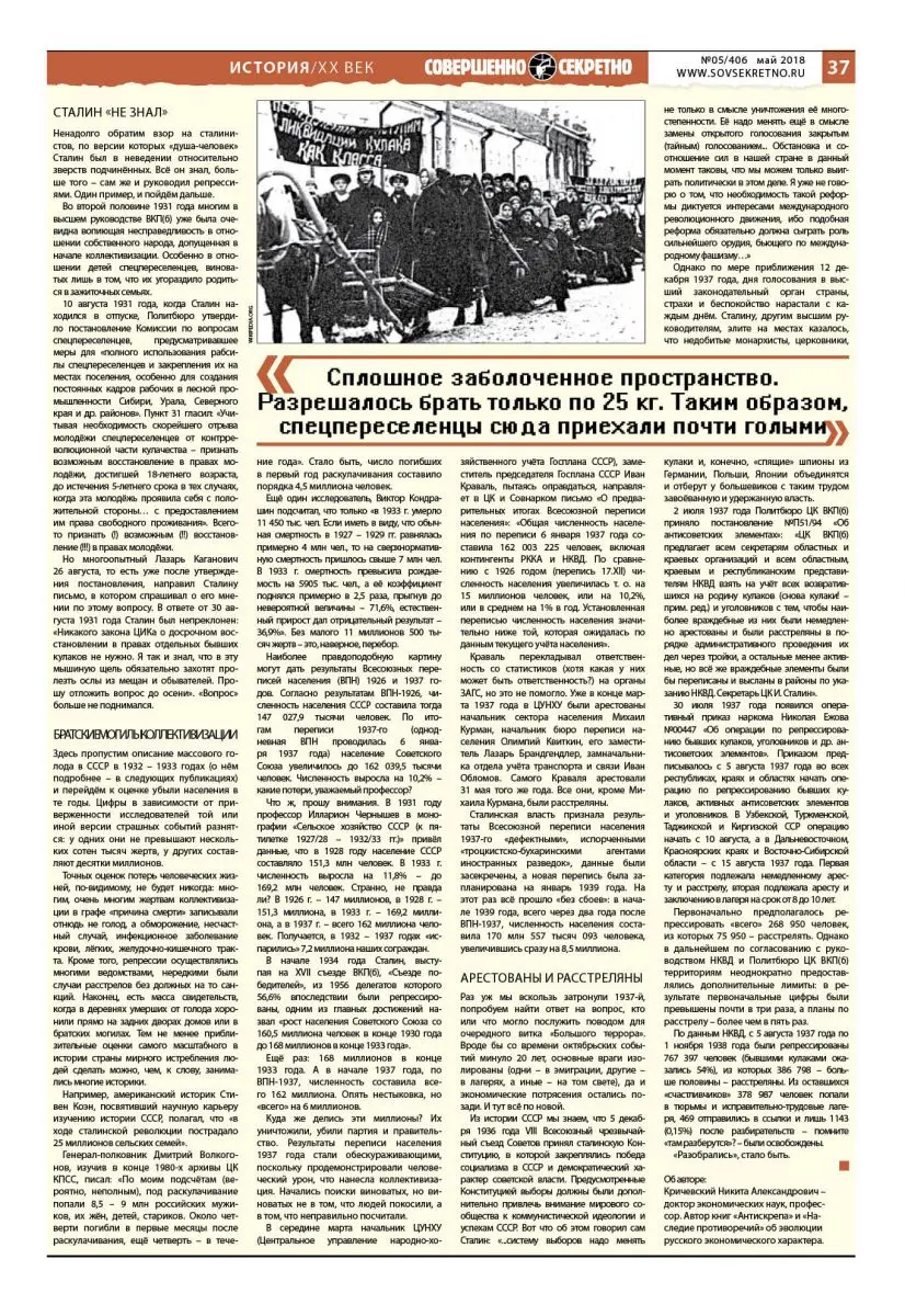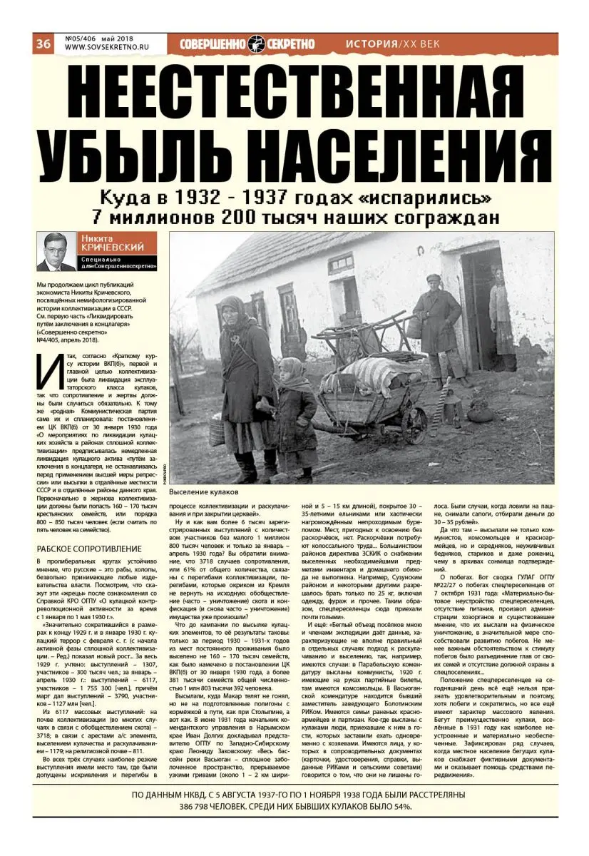 Мы продолжаем цикл публикаций экономиста Никиты Кричевского, посвящённых немифологизированной истории коллективизации в СССР. См. первую часть «Ликвидировать путём заключения в концлагеря» («Совершенно секретно» №4/405, апрель 2018).
