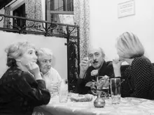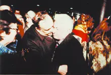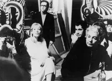 | В студии у Бориса Мессерера. Прощальный вечер перед вынужденным отъездом в Германию. Декабрь 1980 года. На фото: в центре – жена В. Войновича Ирина. Стоит – поэт Виктор Есипов, со стаканом – немецкий журналист Дитер Мюллер | |