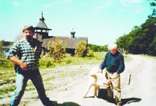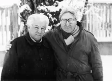 | Рязанов встречает Войновича в аэропорту Шереметьево после эмиграции, 1992 год. Друзья близки и по духу, и по дачам. Их загородные дома находятся по соседству в дачном кооперативе «Советский писатель» под Ватутинками | |