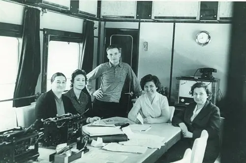 Алексей Сальников со стенографистками в «спецвагоне» Хрущёва