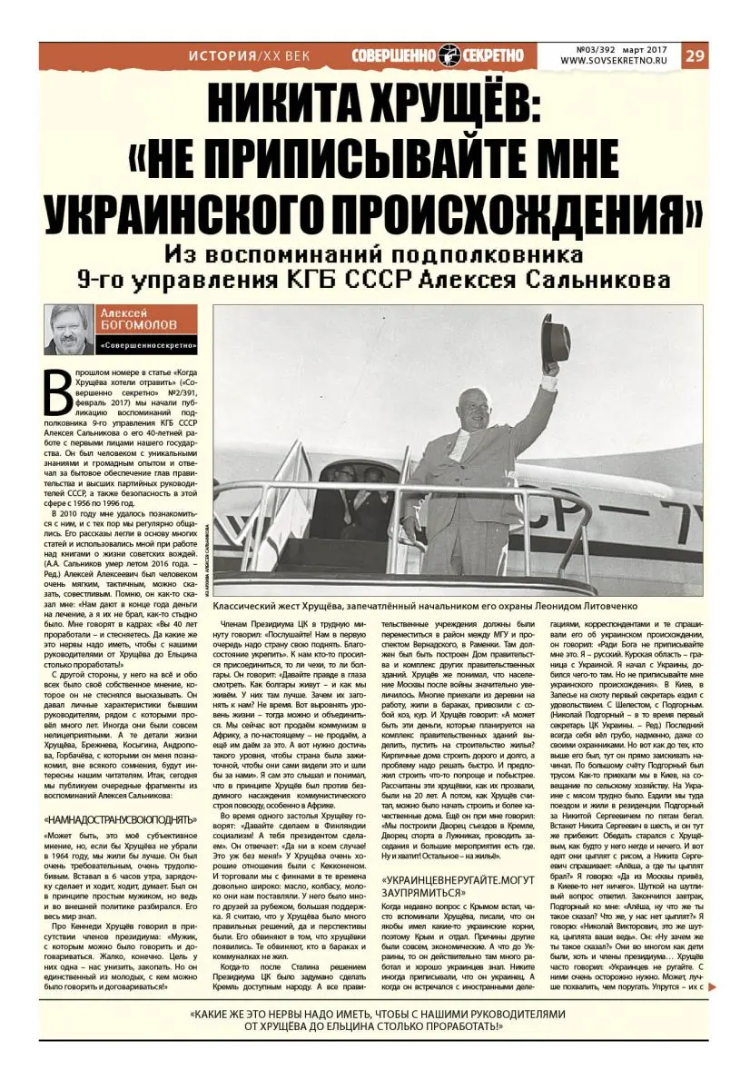 В прошлом номере в статье «Когда Хрущёва хотели отравить» («Совершенно секретно» №2/391, февраль 2017) мы начали публикацию воспоминаний подполковника 9-го управления КГБ СССР Алексея Сальникова о его 40-летней работе с первыми лицами нашего государства. Он был человеком с уникальными знаниями и громадным опытом и отвечал за бытовое обеспечение глав правительства и высших партийных руководителей СССР, а также безопасность в этой сфере с 1956 по 1996 год.
