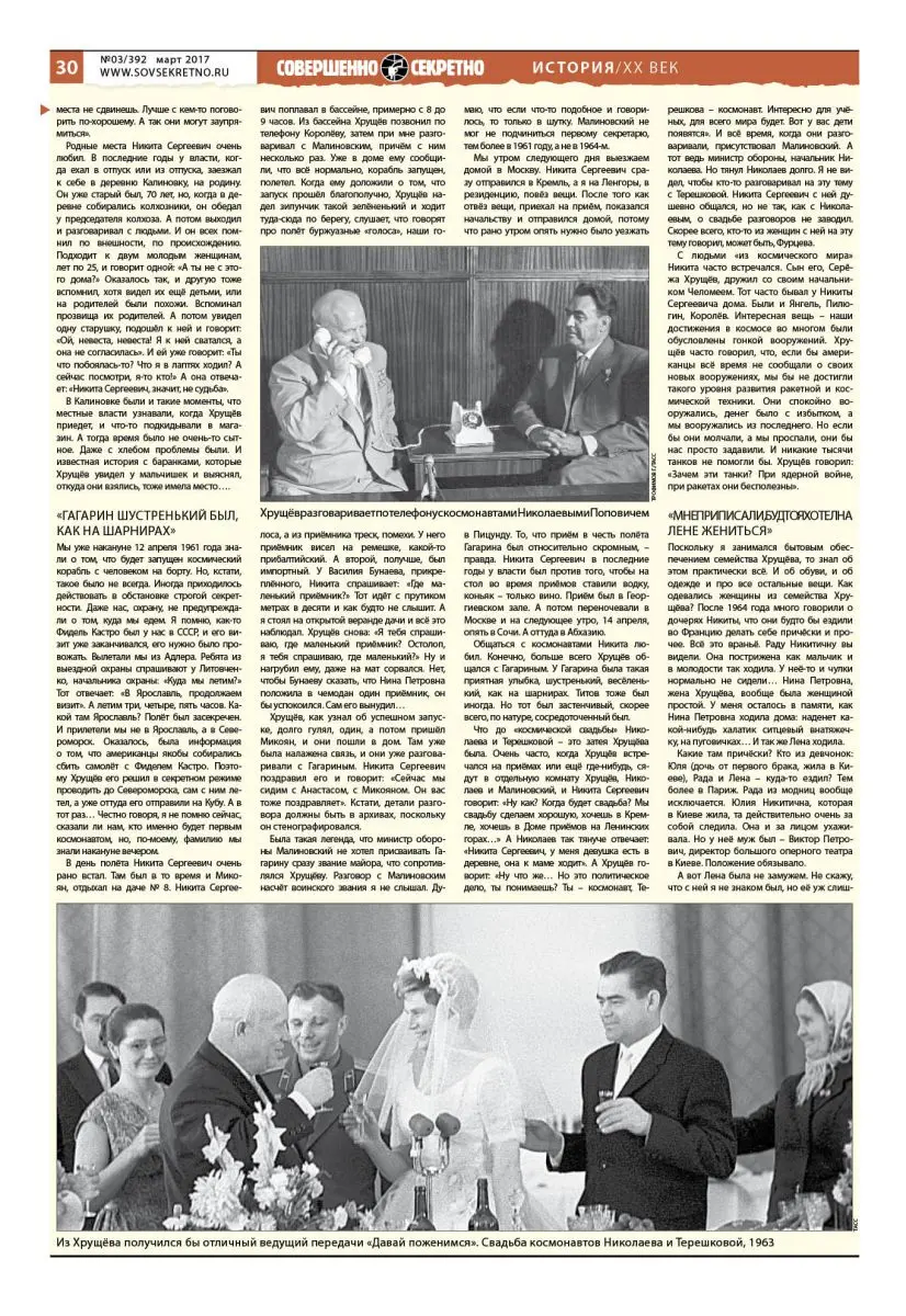 Что до «космической свадьбы» Николаева и Терешковой – это затея Хрущёва была. Очень часто, когда Хрущёв встречался на приёмах или ещё где-нибудь, сядут в отдельную комнату Хрущёв, Николаев и Малиновский, и Никита Сергеевич говорит: «Ну как? Когда будет свадьба? Мы свадьбу сделаем хорошую, хочешь в Кремле, хочешь в Доме приёмов на Ленинских горах…» А Николаев так тянуче отвечает: «Никита Сергеевич, у меня девушка есть в деревне, она к маме ходит». А Хрущёв говорит: «Ну что же… Но это политическое дело, ты понимаешь? Ты – космонавт, Терешкова – космонавт. Интересно для учёных, для всего мира будет. Вот у вас дети появятся». И всё время, когда они разговаривали, присутствовал Малиновский. А тот ведь министр обороны, начальник Николаева. Но тянул Николаев долго. Я не видел, чтобы кто-то разговаривал на эту тему с Терешковой. Никита Сергеевич с ней душевно общался, но не так, как с Николаевым, о свадьбе разговоров не заводил. Скорее всего, кто-то из женщин с ней на эту тему говорил, может быть, Фурцева.