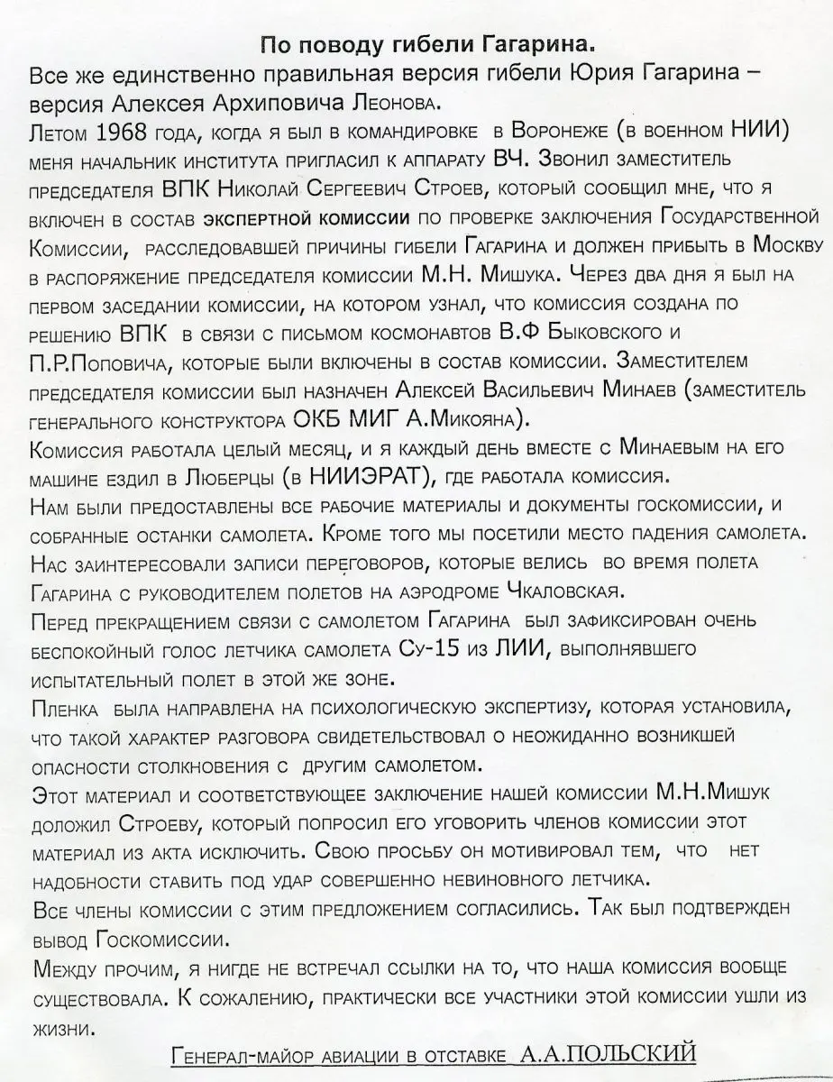 Знакомился с этими документами Алексей Архипович, соблюдая некоторые условия. Например, неразглашение части личных данных. Кроме того, копирование, а тем более сканирование оригиналов также не допускалось. Но существуют и другие пути подтверждения версии Леонова, в том числе и документальные свидетельства. Один экспертный документ он передал редакции «Совершенно секретно» для публикации, приложив к нему собственноручно написанный текст, в котором самым тщательным образом анализирует причину катастрофы гагаринского УТИ МиГ-15.