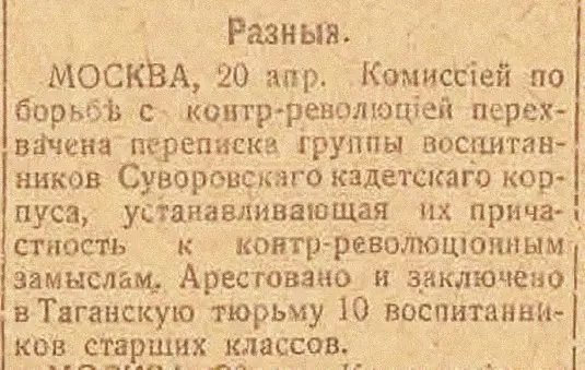 Апрель 1918. Газетная заметка о «заговоре» воспитанников кадетского корпуса