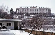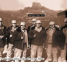 Бывшая резиденция Амина, дворец Тадж-Бек. Внизу: бойцы группы «Гром» на фоне дворца Тадж-Бек, 24 декабря 1979 года |
