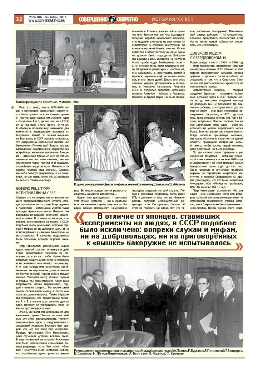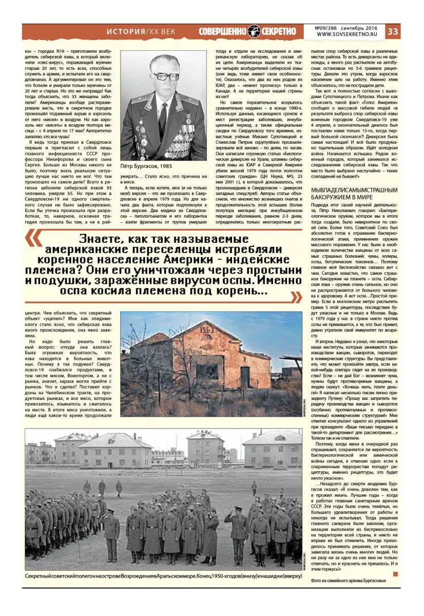 Опасны ли были эти исследования для населения страны? Могли ли сами учёные случайно спровоцировать «утечку» смертоносных ядов, а следовательно – эпидемию? Академик Бургасов был уверен, что нет, всё было под контролем. Правда, признавался Пётр Николаевич, одна случайная «утечка» всё-таки была. В ходе испытаний на острове Возрождения была использована сильнейшая боевая рецептура оспы. Что значит «боевая»? Рецептура была настолько сильна, что «пробивала» даже привитых животных. Её микрочастицы могли разноситься ветром на многие километры…