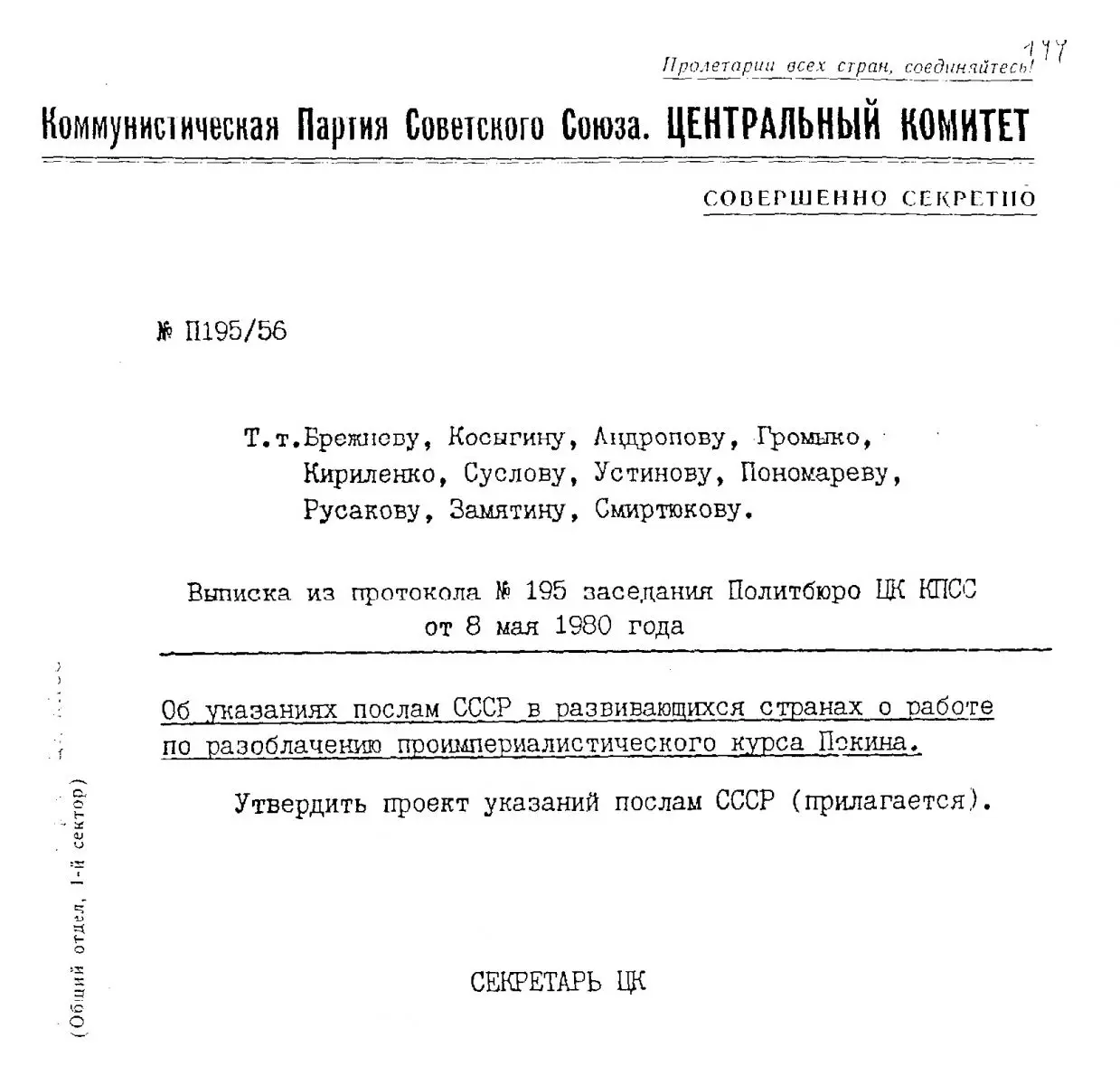 8 мая 1980 года Политбюро ЦК КПСС на своем заседании утвердило примечательный секретный документ «Об указаниях послам СССР в развивающихся странах о работе по разоблачению проимпериалистического курса Пекина». Указания высочайшей инстанции напоминали скорее панический крик, нежели хорошо продуманную, четкую и недвусмысленную инструкцию. Во всяком случае, это послание Политбюро вряд ли могло ориентировать советских послов на какие-то вполне конкретные меры и действия, поскольку никаких внятных практических предложений там не содержалось.