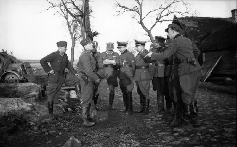 БРОНИСЛАВ КАМИНСКИЙ С ЧЛЕНАМИ СВОЕГО ШТАБА И СОТРУДНИКАМИ НЕМЕЦКОЙ ПОЛИЦИИ ПОРЯДКА. МАРТ 1944 ГОДА, ОККУПИРОВАННАЯ БЕЛОРУССИЯ