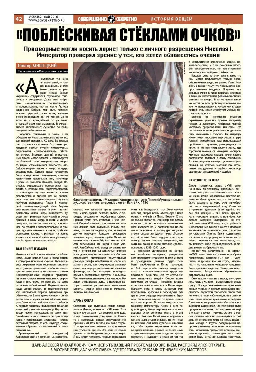 Очки пошли – нет, не в народ, это случилось лишь в ХХ веке, – в аристократическую среду. Прежде выказывавшие презрение всяким учёным и прочим всезнайкам аристократы перестали стесняться очков. Уже не только в тиши кабинетов, но и в салонах очки стали вполне привычным атрибутом. С очками на носу знатные особы теперь позировали художникам, что прекрасно было продемонстрировано на выставке «А ещё в очках!» в Музее Пушкина. Однако в России, отличавшейся и отличающейся по сей день от остального мира по неким глубинным, иногда с трудом поддающимся непротиворечивому описанию основаниям, очки оставались предметом опасным, свидетельствующим о вольнодумстве и своеволии. Ведь на той же выставке посетитель видит в основном портреты представителей аристократии творческой, свободолюбивой, которой власть никогда не доверяла.