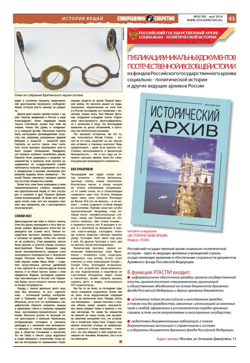 Что занимает историков, так это то, чем пользовался Иосиф Сталин – носил ли он очки, нацеплял на нос пенсне или вставлял в глазницу монокль? Ведь предположить – даже если принять его, Сталина, непогрешимость и физическую безупречность, – что в его годы он сохранил хорошее зрение, было бы слишком даже для правоверного сталиниста…