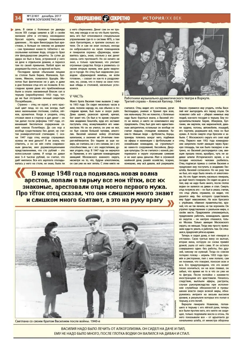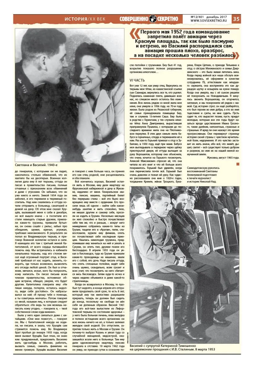 Моего брата Василия тоже вызвали 2 марта 1953 года. Он сидел несколько часов в зале, полном народу, но, как обычно в последнее время, был пьян и скоро ушёл. Дома шумел, разносил врачей, кричал, бог знает что. Он был в то время слушателем академии Генштаба, куда его заставил поступить отец, возмутившийся его невежеством. Но он не учился, он уже не мог, он был совсем больной человек, алкоголик. Василий начинал войну 20-летним капитаном, а окончил её 24-летним генерал-лейтенантом. Его тащили за уши наверх, не считаясь ни с его силами, ни с его способностями, ни с его недостатками, думая угодить отцу. В 1947 году он вернулся из Германии, и его сделали командующим авиацией Московского военного округа, несмотря на то, что, будучи алкоголиком, он сам уже не мог летать. С этим никто не считался. Отец видел его состояние, ругал беспощадно, унижал и бранил при всех, как мальчишку. Это не помогло, с болезнью надо было бороться иначе, а Василий этого не желал, и никто не осмеливался ему предложить. Отец был для него единственным авторитетом, остальных он вообще не считал людьми, стоящими взимания. Какие-то тёмные люди – футболисты, борцы, тренеры толклись вокруг него, подбивая на аферы и махинации с футбольными и хоккейными командами, на строительство каких-то сооружений, бассейнов, Дворцов культуры. Он не считался с казной, распоряжался в округе огромными суммами и не знал цены деньгам. Жил в огромной казённой даче, развёл хозяйство, псарню, конюшню, ему всё давали, всё разрешали. Власик стремился ему угодить, чтобы Василий мог выгородить его перед отцом. Он позволял себе всё – убирал немилых ему людей, кое-кого посадил в тюрьму. Ему покровительствовали Берия, Абакумов, Булганин, им вертели, как марионеткой, давали ордена, погоны, автомобили, лошадей, его портили, разрешали всё, пока он был нужен. А после смерти отца бросили и забыли. С Московского округа его снял ещё отец. Первого мая 1952 года командование запретило полёт авиации через Красную площадь, так как было пасмурно и ветрено, но Василий распорядился сам, авиация прошла плохо, вразброс, чуть не задевая шпили Исторического музея, а на посадке несколько человек разбилось. Отец подписал приказ о снятии Василия и предложил ему поступить в академию Генштаба, Василий согласился. Но ни разу там не был, его надо было лечить от алкоголизма. Но кто будет лечить насильно генерала, да ещё такого генерала. Он сидел на даче и пил, ему не надо было много, после глотка водки он валился на диван и спал. Смерть отца потрясла его – он был в ужасе, считая, что отца убили, отравили, он видел, что рушится мир, без которого существовать ему будет невозможно. На всех бросался с упрёками, обвинил правительство, врачей, что не так лечили, не так хоронили. Он утратил представление о реальном мире, о своём месте. Предложили утихомириться, предложили работать, командовать одним из округов – он наотрез отказался, только Москва. Только авиация Московского округа, не меньше. Тогда ему просто приказали куда-то уехать и работать там. Он отказался, предпочёл уйти из армии