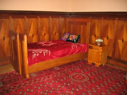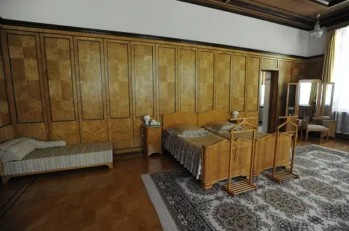 Формально главным местом для сна генералиссимуса была его спальня на Ближней даче, которая выглядела крайне неуютной. Мне пришлось побывать в этом помещении площадью чуть более 60 квадратных метров. Как и в других помещениях дачи, стены спальни на высоту примерно полтора метра от пола отделаны деревом. Есть деревянная отделка и по периметру потолка. Практически весь пол закрыт красным ковром. Собственно «спальных мест» в комнате два: кровать орехового дерева с высокими спинками, скорее «одиночная», чем полуторная, и диван. Диван имеет мягкую угловую спинку, что показывает его предназначение: в случае необходимости присесть или прилечь. Рядом с кроватью стоит небольшая тумбочка, тоже отделанная светлым орехом. Справа от двери стоят книжный шкаф и гардероб.