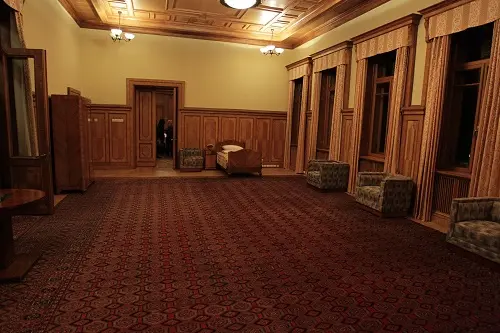 Ещё одним местом, где Сталин мог «прикорнуть», был Малый дом. Мне сразу бросилась в глаза довольно скромная обстановка: односпальная кровать, отделанная светлой карельской берёзой, выдержанная в таких же тонах прикроватная тумбочка с лампой и пепельницей. Чуть выше – кнопка вызова охраны. Отопление в доме было печное. И кровать, естественно, стояла поблизости от печки. Ещё в комнате был платяной шкаф, в котором при жизни вождя хранились несколько комплектов нижнего белья, кальсоны, рубашки, халаты, полотенца.