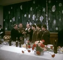 Л.И. Брежнев с космонавтами. Весь арсенал спиртного на переднем плане. 1969 год