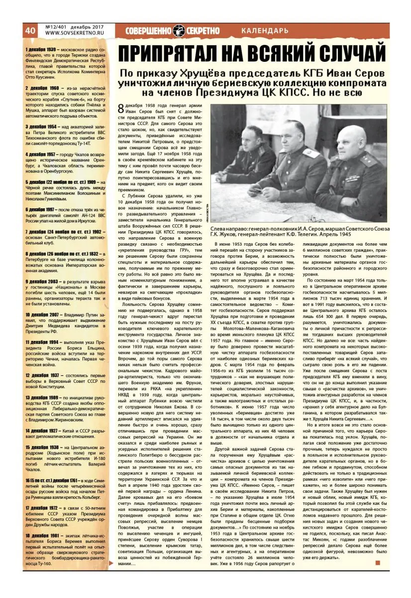 По приказу Хрущёва председатель КГБ Иван Серов уничтожил личную бериевскую коллекцию компромата на членов Президиума ЦК КПСС. Но не всю