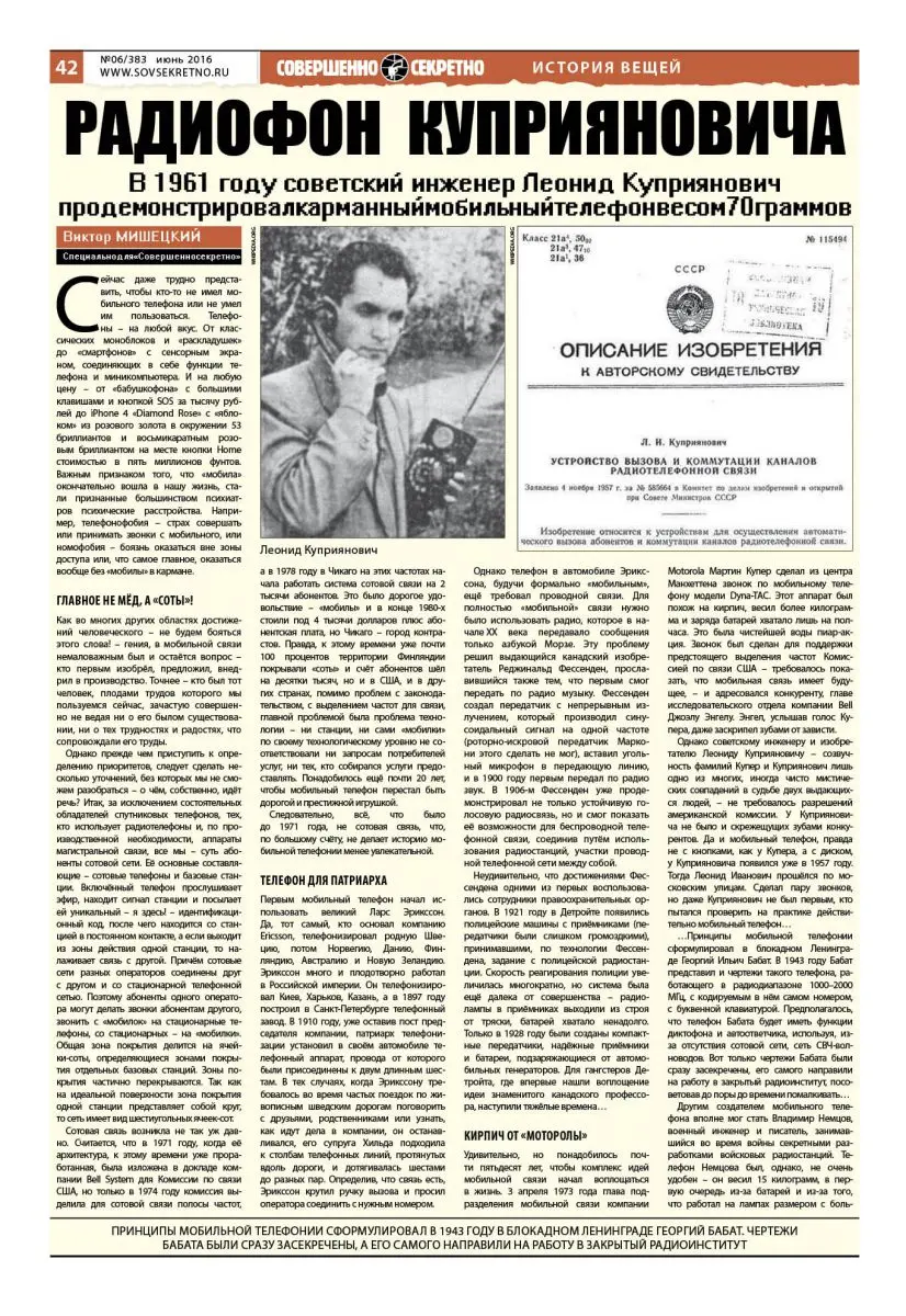… Леонид Куприянович был тем не менее первым, кто в 1957 году, получил авторское свидетельство на своё изобретение – автоматический радиотелефон с прямым набором. Его ЛК-1 весил три килограмма, номер, как и в телефоне Бабата, кодировался в самом аппарате, что делало ЛК-1 первым действующим мобильным телефоном, а не носимой «радиотрубкой». Так как Куприянович был знаком с работой сотрудников фирмы Bell Дугласа Ринга и Рея Янга, в 1947 году предложившими принцип «сот» для мобильной телефонии, он более чем оптимистически прогнозировал развитие своего детища. Предполагая, что в недалёком будущем покрытие «сотами» будет широким, Куприянович видел в ЛК-1 только первый шаг полноценной мобильной связи