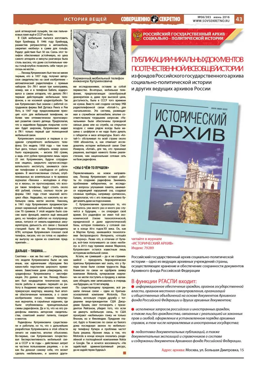 Однако советскому инженеру и изобретателю Леониду Куприяновичу – созвучность фамилий Купер и Куприянович лишь одно из многих, иногда чисто мистических совпадений в судьбе двух выдающихся людей, – не требовалось разрешений американской комиссии. У Куприяновича не было и скрежещущих зубами конкурентов. Да и мобильный телефон, правда не с кнопками, как у Купера, а с диском, у Куприяновича появился уже в 1957 году. Тогда Леонид Иванович прошёлся по московским улицам. Сделал пару звонков, но даже Куприянович не был первым, кто пытался проверить на практике действительно мобильный телефон…