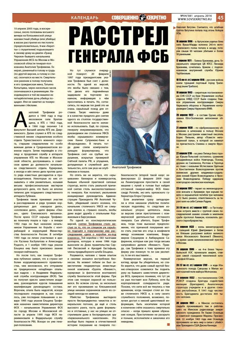 Убийство Трофимова выглядело просто беспрецедентно: чекистов в генеральских погонах, да ещё и столь высокого ранга, пусть даже формально и отставных, у нас на улицах не отстреливали даже в беспредельную эру «первоначального накопления». Это вообще было первое в отечественной истории покушение на генерала госбезопасности (второй такой казус зафиксирован 22 февраля 2009 года: на Ленинградском проспекте в своей машине с пулей в голове был найден отставной генерал-майор ФСБ Александр Рогачёв, экс-зять орловского губернатора Егора Строева).