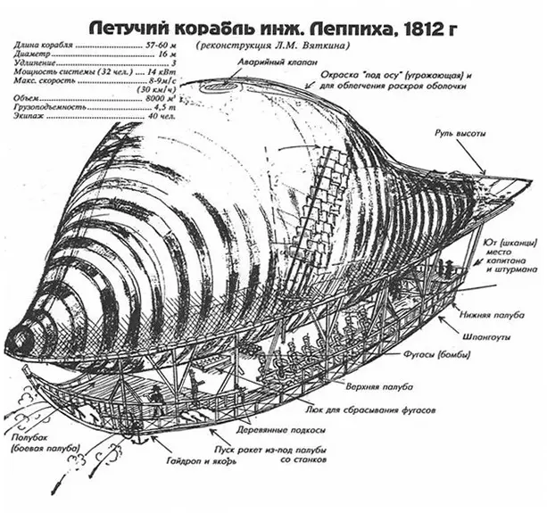 Полторы сотни плотников, кузнецов и швей не покладая рук трудились над созданием детища Франца Леппиха. Фактически это должен был быть первый в мире «бомбардировщик» с 40-местной лодкой-гондолой посредине, в которой был предусмотрен люк для сбрасывания на врага пороховых фугасов. А передвижение дирижабля в воздухе должно было осуществляться при помощи крыльев, приводимых в действие мускульной силой специально обученных «гребцов». По внешнему виду этот дирижабль объемом примерно 800 кубометров напоминал кита. Для получения водорода вдоль стен дирижабля располагались бочки с серной кислотой и железными опилками – в них должна была идти химическая реакция.