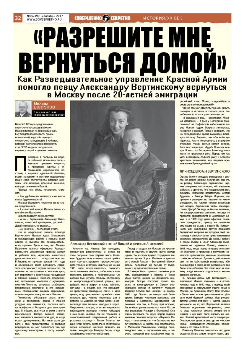 Однако было у молодого разведчика и другое, не менее важное поручение: вернуть на родину Александра Вертинского. Вернее, завершить этот процесс, ибо начинали работать с артистом его предшественники, офицеры Токийской резидентуры Сергей Будкевич и Виктор Зайцев. Впрочем, напрямую к разведке это задание не имело отношения. Ну какими такими секретами мог владеть Вертинский, чтобы заинтересовать Центр? Он ведь не был ни военным, ни государственным деятелем, никогда не проявлял враждебности к Советскому Союзу, а к 1939 году даже оформил советское гражданство, правда, не дававшее ему право на въезд в страну. По небрежности или каким-либо другим причинам Вертинский вовремя не продлил свой загранвид и вскоре утратил право называться советским гражданином. До войны вопрос о своём въезде в СССР Александр Николаевич не поднимал. Однако, начиная с 1938 года, когда певец впервые письменно обратился с просьбой о получении советского гражданства, военные разведчики о нём не забывали. Думается, действовали они не по собственной инициативе, ибо резидентуре в Токио и без Вертинского дел было хоть отбавляй. Это стало ясно и Иванову, когда началась подготовка к командировке в Японию.