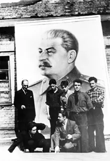 | Студенты Полиграфического института готовятся к первомайской демонстрации, 1952 год. Слева стоит профессор И. И. Чекмазов. Однокашники: Л. Гольдберг, Ю. Борисенко, А. Кузнецов, Ю. Молоканов. Слева на корточках — Б. Жутовский, справа – Дан Думитреску, румын. У каждой московской организации были свои портреты руководителей партии и советского правительства. За ними ухаживали, чистили | |