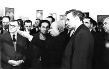 | Выставка в Манеже «30-летие МОСХ», 1 декабря 1962 года. На фото: П. Сатюков («Правда»), С. Герасимов (в очках), В. Лебедев (помощник Хрущёва), охранник Хрущёва, Б. Жутовский, Н. Хрущёв, М. Суслов, Д. Полянский (виден из-за спины Суслова), В. Серов (президент Академии художеств СССР) | |