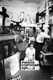 | Э. Неизвестный, Б. Жутовский, С. Хрущёв в мастерской Неизвестного, 1973 год. Общая сумма расходов на изготовление памятника Хрущёву на Новодевичьем кладбище составила 12 тысяч рублей, 3 из которых выделил ЦК, а 9 — семья. Сумма гонорара не обсуждалась, так как авторы понимали, как престижен такой заказ. За голову отвечал Неизвестный. Жутовский — за постамент и буквы. Отливали на монументальной фабрике в Мытищах. Разрешения на установку памятника не давали до тех пор, пока вдова не позвонила Косыгину, который задал ей всего один вопрос: «Вам нравится?» Она сказала: «Да». И тут же разрешение дали. Фотографировал Жутовский, поставив камеру на автоспуск | |