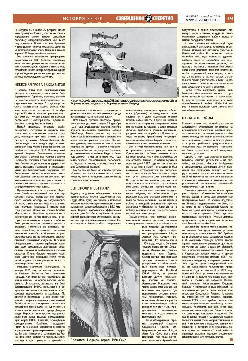 Видимо, подобное объяснение вполне удовлетворило короля Абдул-Азиза Аль Сауда (Ибн-Сауда), на службе у которого тогда же появились русские пилоты и авиамеханики, ранее работавшие в ВВС Хиджаза. Королю требовалось эффективное оружие для борьбы с верблюжьей кавалерией ваххабитских мятежников, выступивших против объединения страны. Его положение в Хиджазе было непрочным: воинственная племенная группа «Ихванов» («Братьев»), исповедовавших ваххабизм, то и дело поднимала мятежи против новой власти. Одной из главных причин стал запрет на совершение набегов на соседние страны, в ходе которых «Братья» грабили и убивали население, уводили женщин в рабство. Кроме того, тогда по всему Аравийскому полуострову шла междоусобная борьба с многочисленными и воинственными кланами.