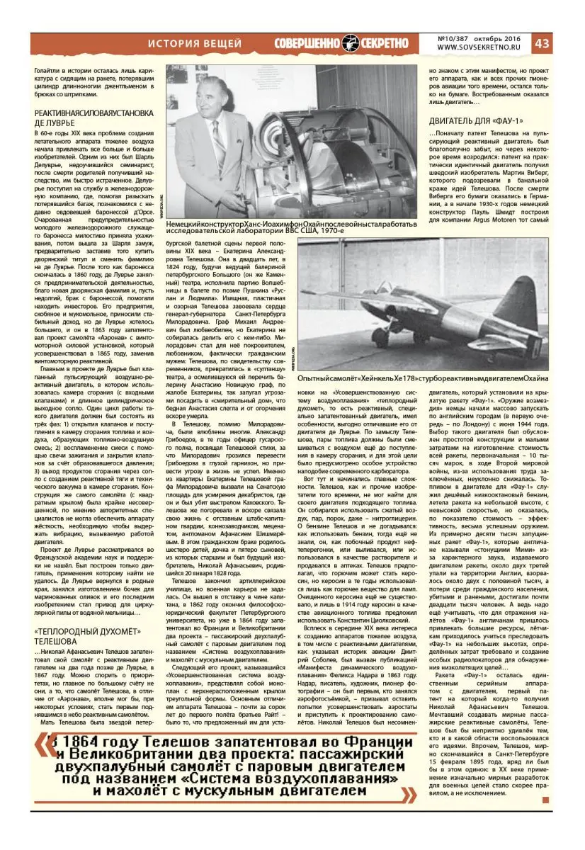 …Николай Афанасьевич Телешов запатентовал свой самолёт с реактивным двигателем на два года позже де Луврье, в 1867 году. Можно спорить о приоритетах, но главное по большому счёту не они, а то, что самолёт Телешова, в отличие от «Аэронава», вполне мог бы, при некоторых условиях, стать первым поднявшимся в небо реактивным самолётом.