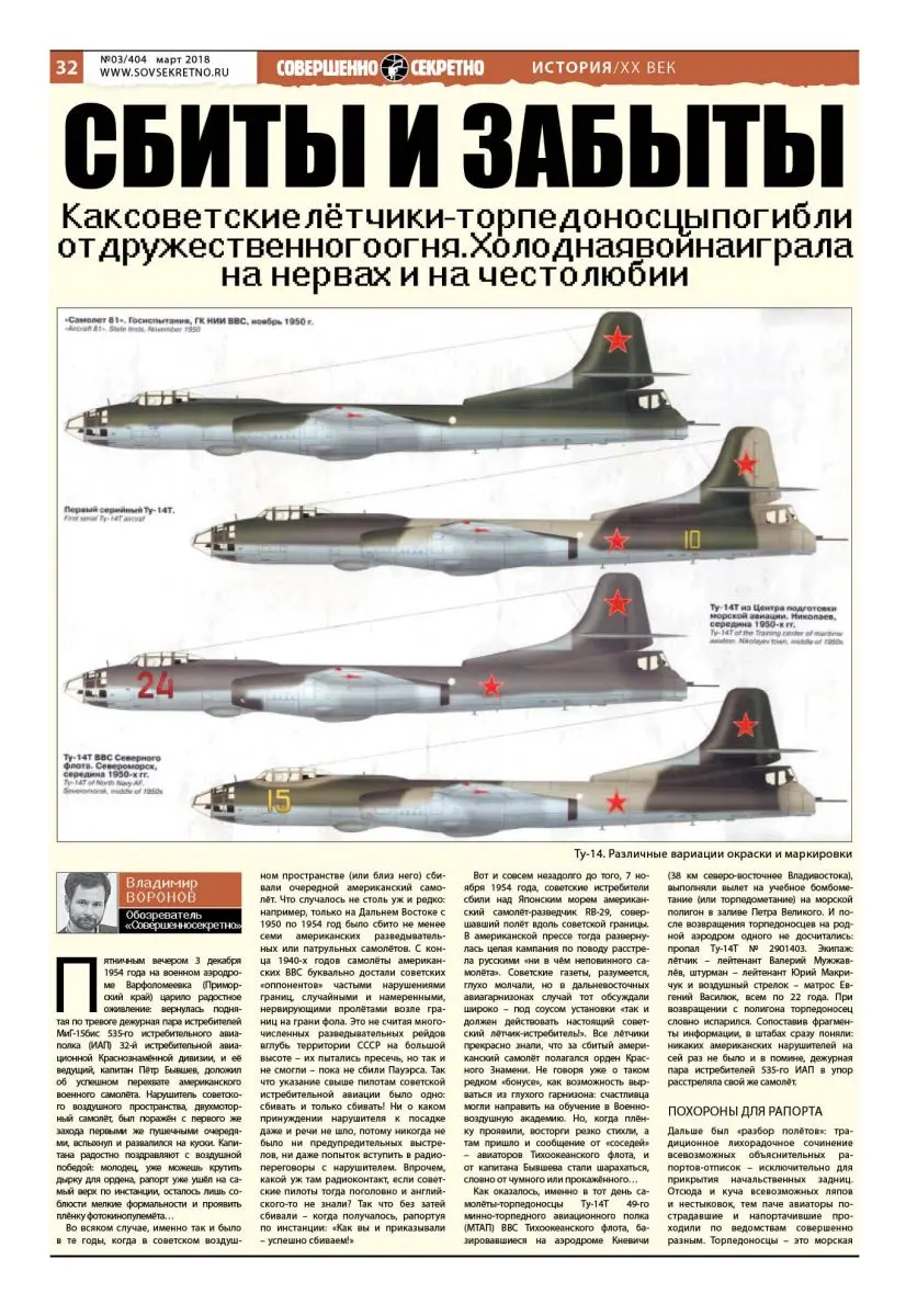 Положим, на Тихоокеанский флот тогда поступило всего лишь 14 таких машин, поверим утверждениям, что они ещё считались секретными и потому пилоты фронтовой авиации и авиации ПВО якобы не были своевременно и официально ознакомлены с её силуэтами. Но к их освоению на Тихоокеанском флоте приступили ещё в марте 1952 года, и летали они весьма интенсивно, так что более чем за 2,5 года их полётов совсем уж не видеть их истребители явно не могли. Но даже если пилот и не знал силуэта Ту-14, факт, что он не сделал и попытки идентификации или принуждения к посадке, не пытался и связаться по рации с Ту-14. Доложив на КП, что перед ним самолёт «незнакомой» конструкции и «без опознавательных знаков», получил приказ открыть огонь и сбил «Туполева»