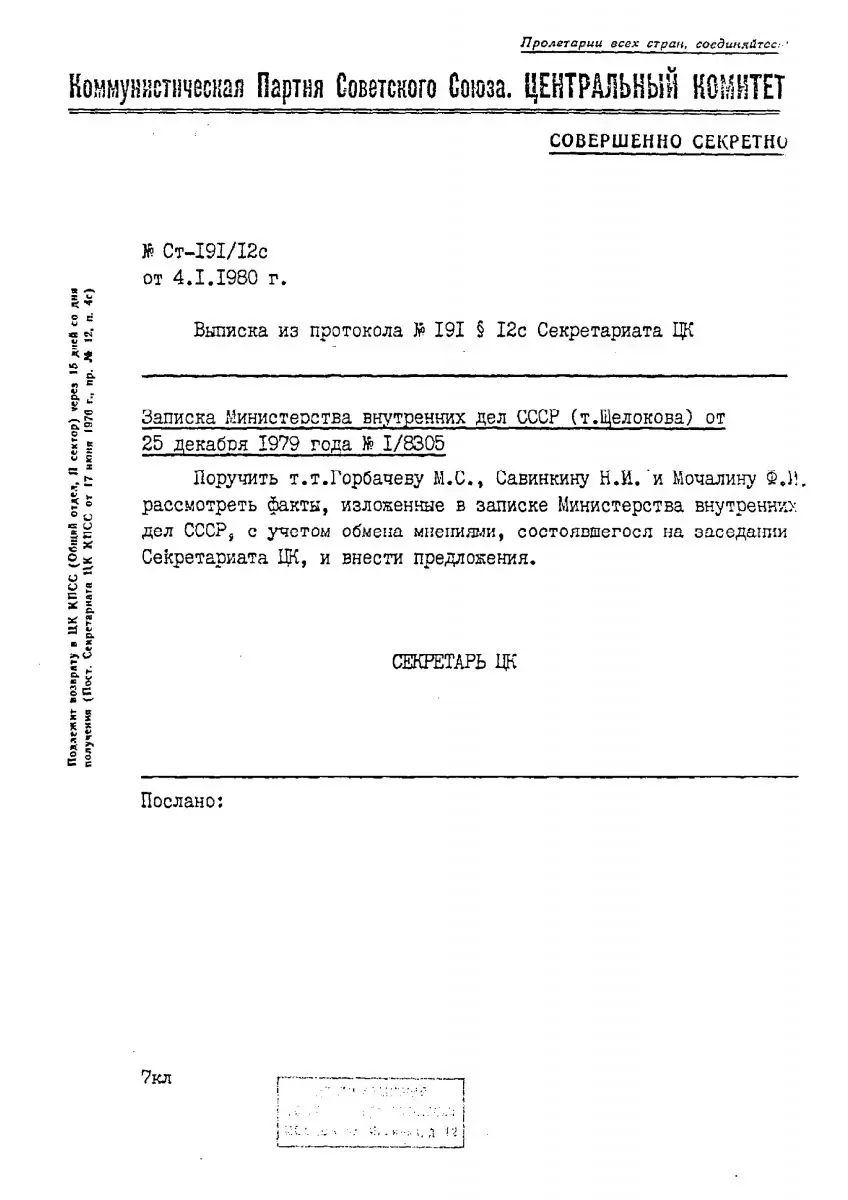 4 января 1980 года Секретариат ЦК поручил разобраться с весьма важным делом «и внести предложения» трем весьма ответственным аппаратчикам: Горбачеву М. С. (на тот момент – секретарь ЦК КПСС), Савинкину Н. И. (заведующий отделом административных органов ЦК КПСС) и Мочалину Ф. И. (заведующий отделом легкой промышленности и товаров народного потребления ЦК КПСС). Собственно обстоятельства дела излагались в служебной записке министра внутренних дел СССР Николая Щёлокова № 1/8305 от 25 декабря 1979 года «Об условиях, способствующих хищениям шерсти в системе ее заготовки и первичной обработки».