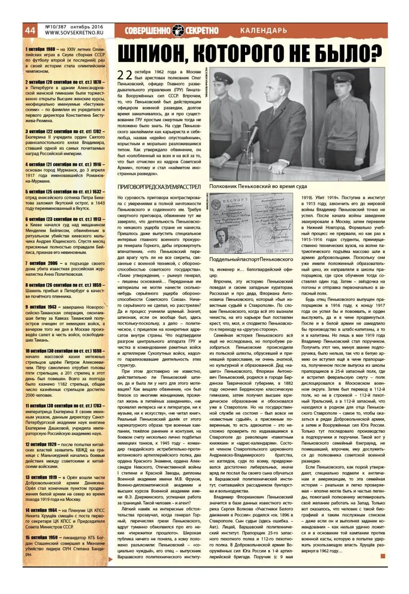 22 октября 1962 года в Москве был арестован полковник Олег Пеньковский, офицер Главного разведывательного управления (ГРУ) Генштаба Вооружённых сил СССР. Впрочем, то, что Пеньковский был действующим офицером военной разведки, долгое время замалчивалось, да и про существование ГРУ простым смертным тогда не положено было знать. На суде Пеньковского заклеймили как карьериста и себялюбца, назвав «идейно опустошённым», корыстным и морально разложившимся типом. Как утверждало обвинение, он был «озлобленный на всех и на всё за то, что был отчислен из кадров Советской Армии», потому и стал «наймитом иностранных разведок».